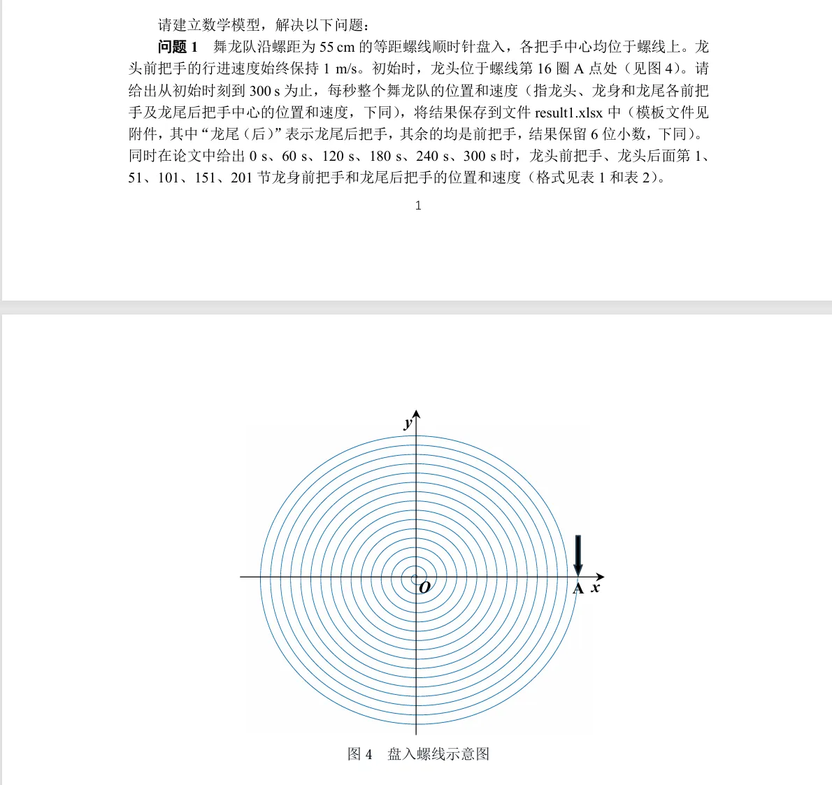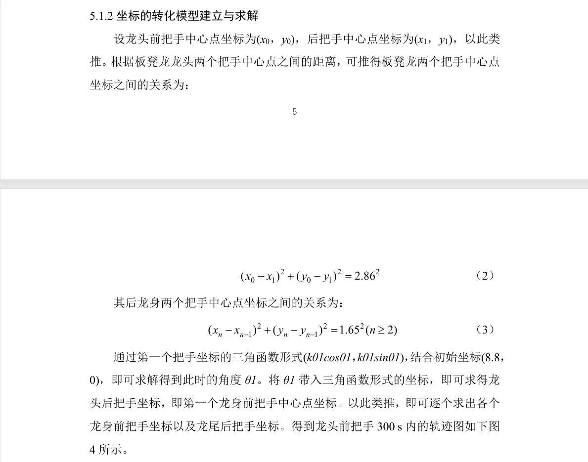 其中$b$为已知螺距0.55m,$S$为路径长。这样可以得到第一个龙把手角度随时间的变化,进而可以得到第一个龙把手坐标随时间的变化; 下面算后面222个(好像是222个龙把手)的坐标变化: